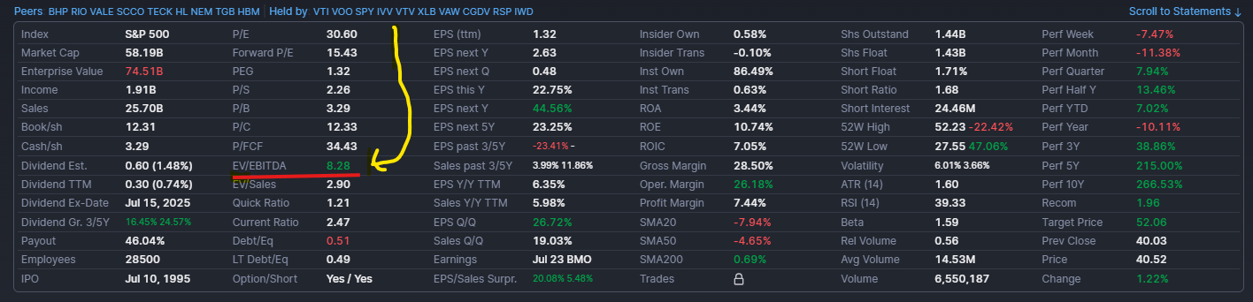 You can see the current ev / ebitda value in the picture below and click the link to see the current Finviz profile of FCX.
